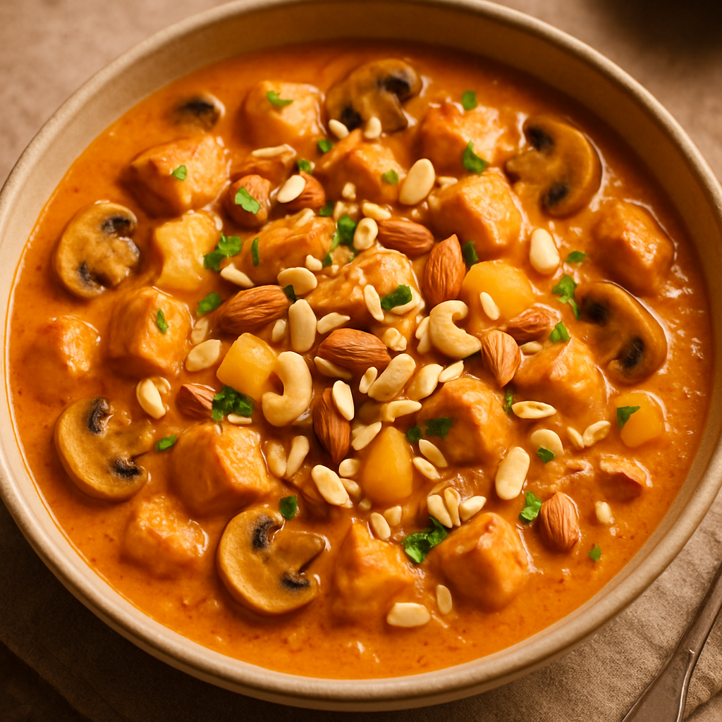 Tender diced chicken simmered in a luxurious tomato and cream gravy, enriched with roasted nuts and sautéed mushrooms, then finished with a touch of sweetness from diced fruits and crunchy nuts, a perfect blend of flavor, texture, and indulgence in every bite.